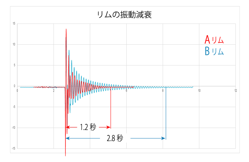 このグラフは、動的粘弾性(DMA)を測定するために2つのリムの振動減衰を測定したものです。 青いリムは、加振した瞬間から2.8秒かかっているのに対して 赤いリムは1.2秒で振動が収まっています。 このように用いるカーボンファイバーの縦弾性係数と積層方向と樹脂量の組み合わせを変えることでいかようにでも乗り心地をコントロールすることが可能です。 動的粘弾性(DMA)を測定する設備は、航空機や自動車産業でようやく認知され始めた工学的知見でありサイクリング用自転車部品に応用されることは世界的にも極めて稀です。 株式会社スミスではCeraLightカーボンホイールの乗り心地を向上させるために「振動調律」と名付けて動的粘弾性(DMA)をコントロールしています。