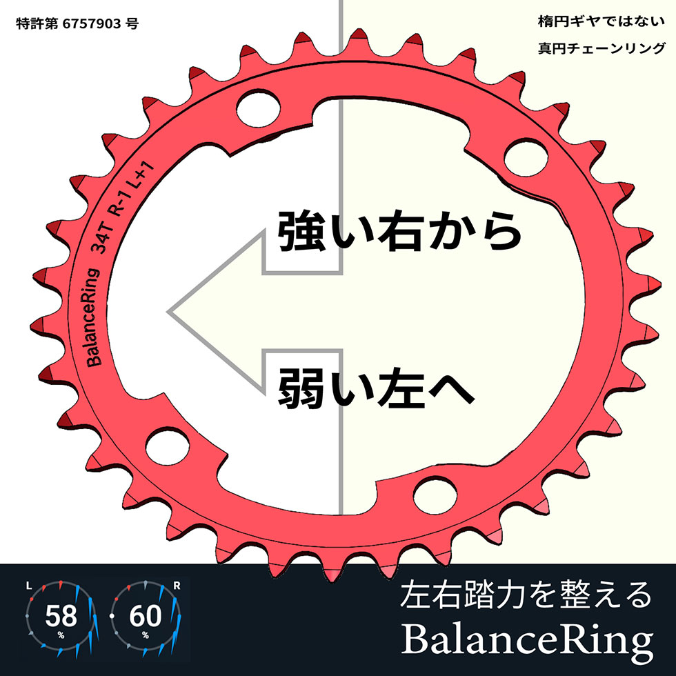 どこか一部が先に疲れるのは、ポジション等に原因があるものです。 左右の脚力に違いがある場合も同様に「疲れやすく」なります。 これを根本的に改善するのが 特許技術を活かしたBalanceRing です。