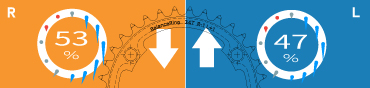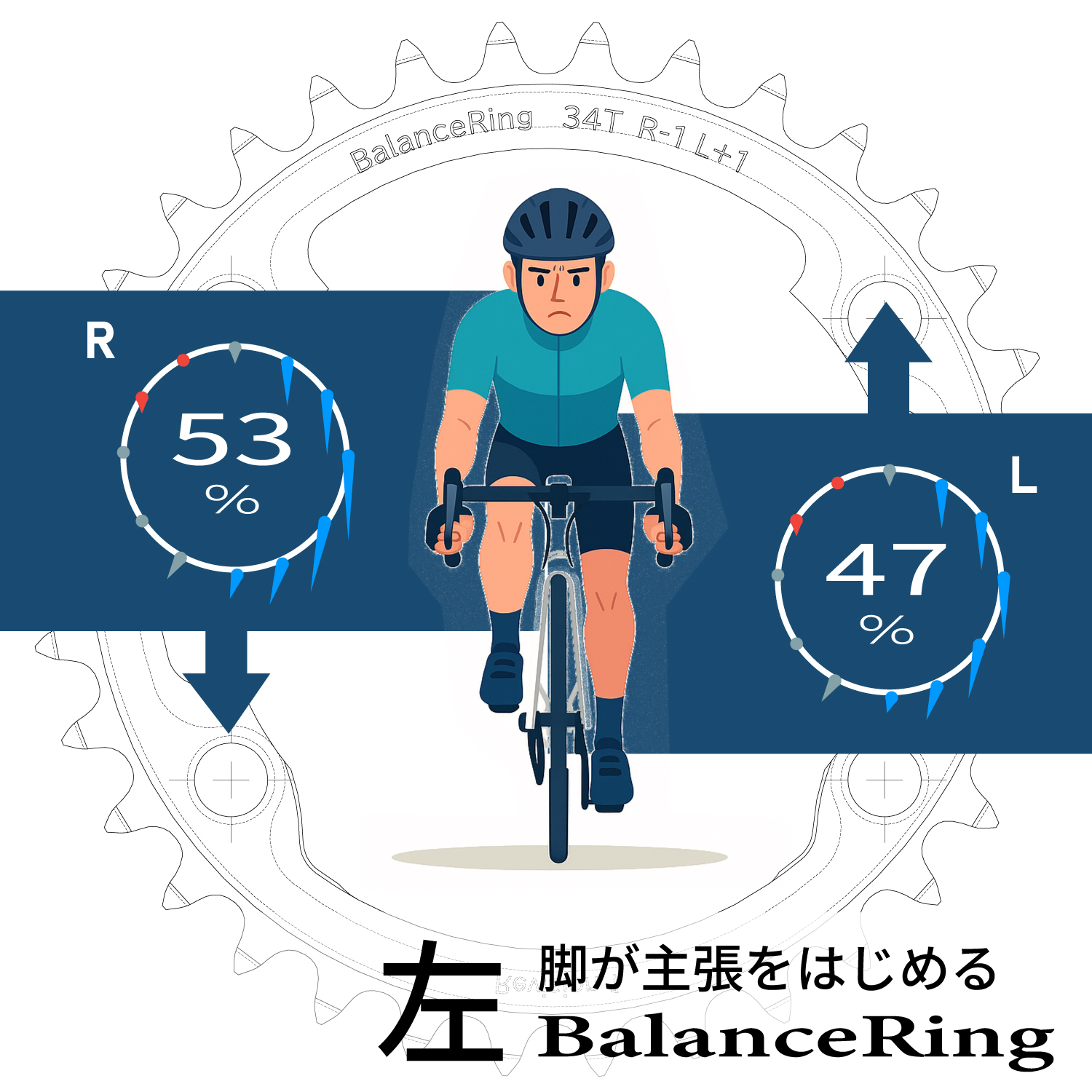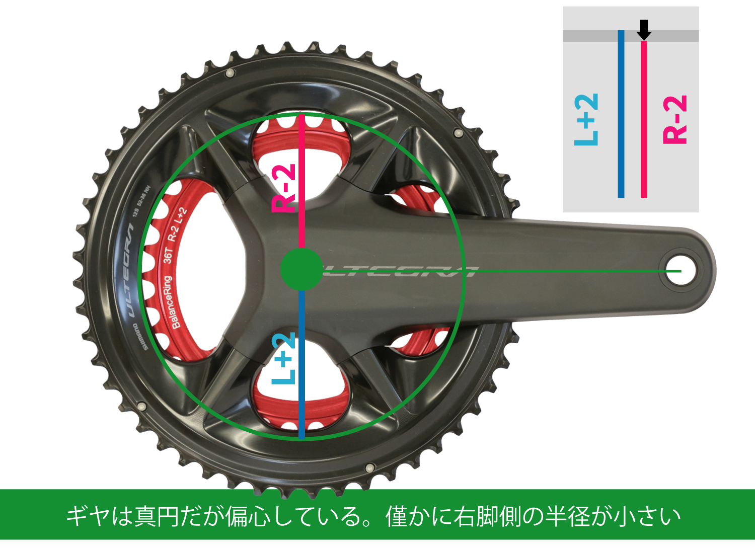 どんな人にも利き脚があります。 私の場合は右脚です。 大腿部周長 右60.5cm 左59.0cm と利き脚のほうが太いです。 ロードバイクをペダリングする際もやはり右脚が優先的に意識され左脚はそれに追従するだけでした。 BalanceRing は右脚の踏力を左脚に配分する機能があります。 ギヤのプロファイル(形状)は真円のままなので楕円ギヤのような強い違和感を感じることはありません。