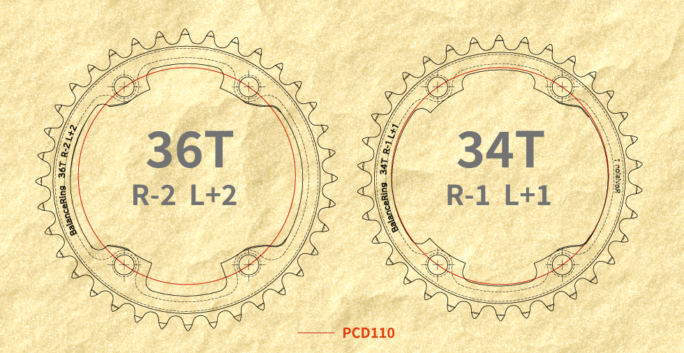 バランスリングは、通常 R-2 L+2 のように右脚を利き足とした表記になっています。 左脚が利き足の場合は、クランクに大して180°点対象に回転させて取り付けて下さい。