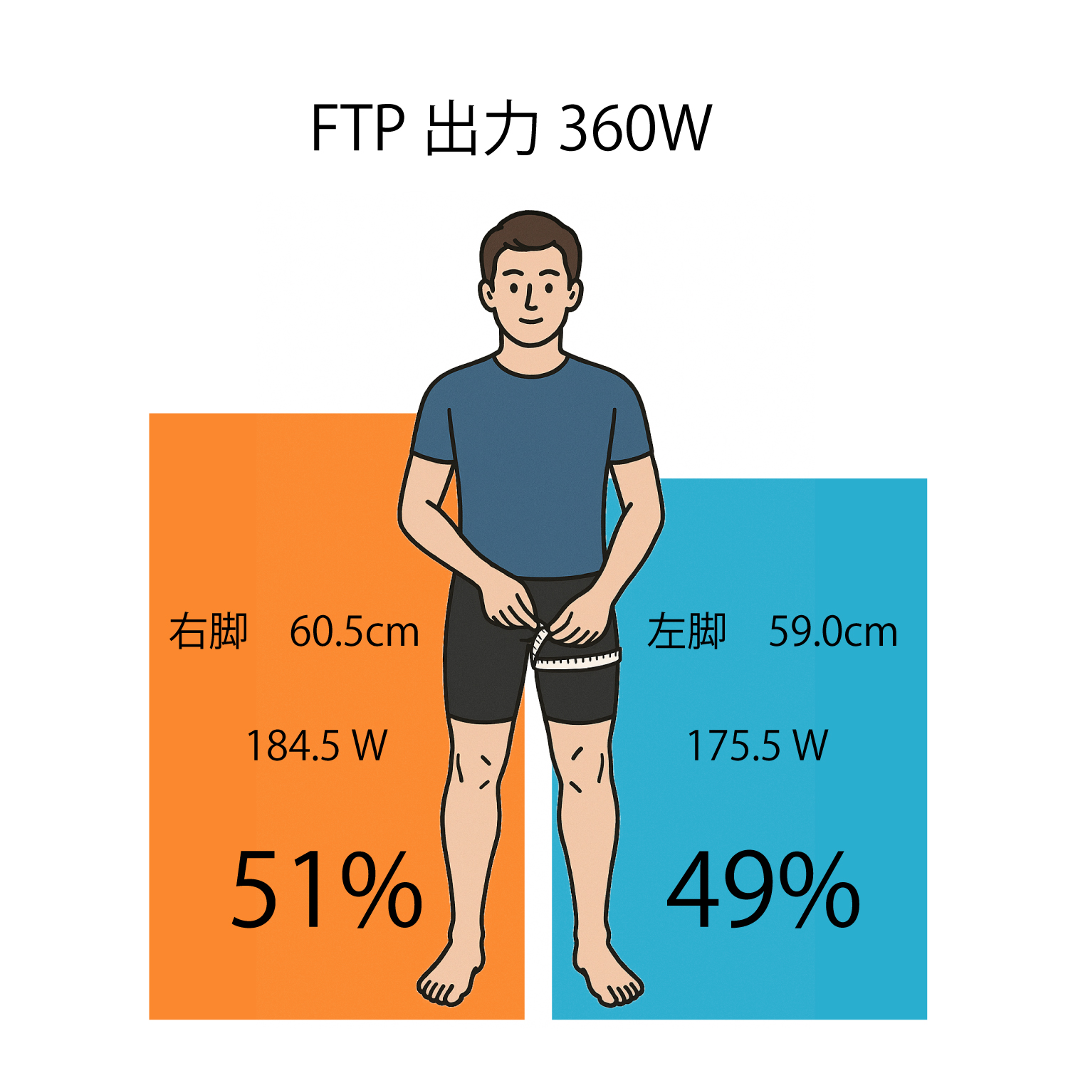大腿部の周長から面積比を求めFTP時の総出力360W の左右配分を求めています。