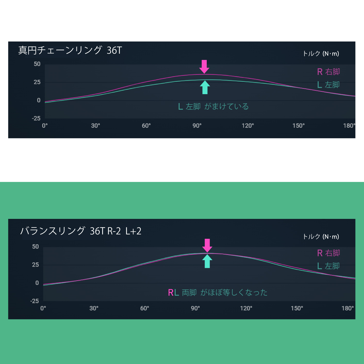 上図は、クランクが一回転する間のクランク軸トルクの変化を測定したトルクカーブです。 上のカーブは、標準的な真円リングのものです。右脚に比べて左脚のトルクが弱いことが解ります。 下のカーブは、BalanceLing に交換し同じコースを走った際のものです。 左右脚のトルクカーブが見事に一致するまで左右脚が均一化されたことが解ります。